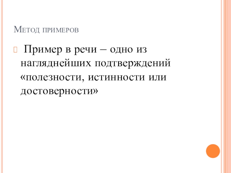 Метод примеров Пример в речи – одно из нагляднейших подтверждений «полезности, истинности или достоверности»