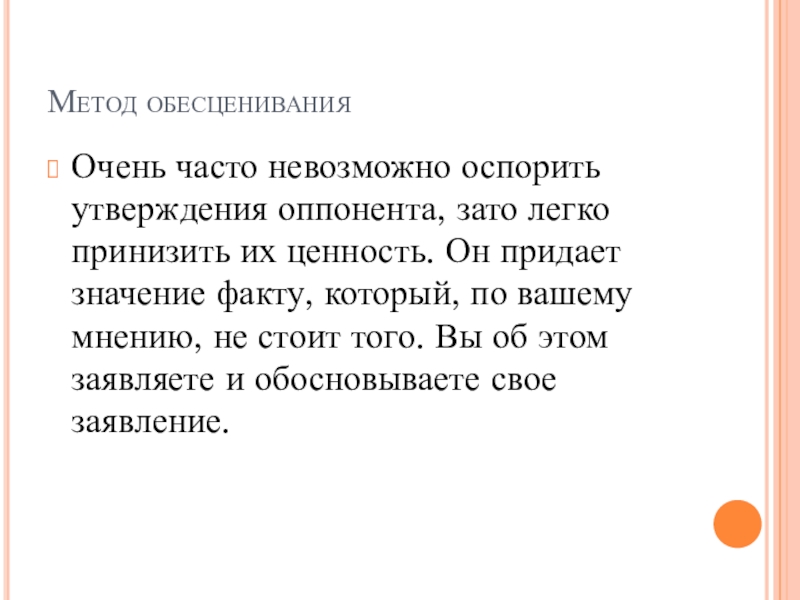 Метод обесценивания Очень часто невозможно оспорить утверждения оппонента, зато легко принизить их ценность. Он придает значение факту,