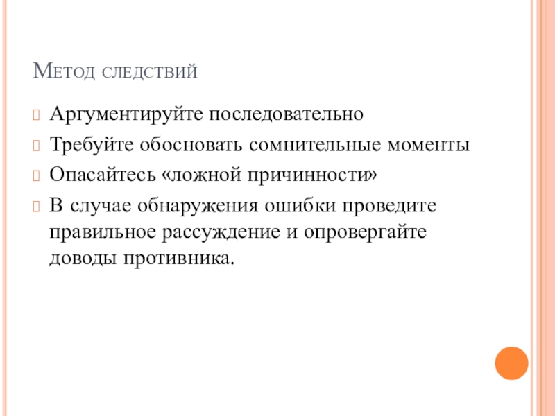 Метод следствий Аргументируйте последовательно Требуйте обосновать сомнительные моменты Опасайтесь «ложной причинности» В случае обнаружения ошибки проведите правильное