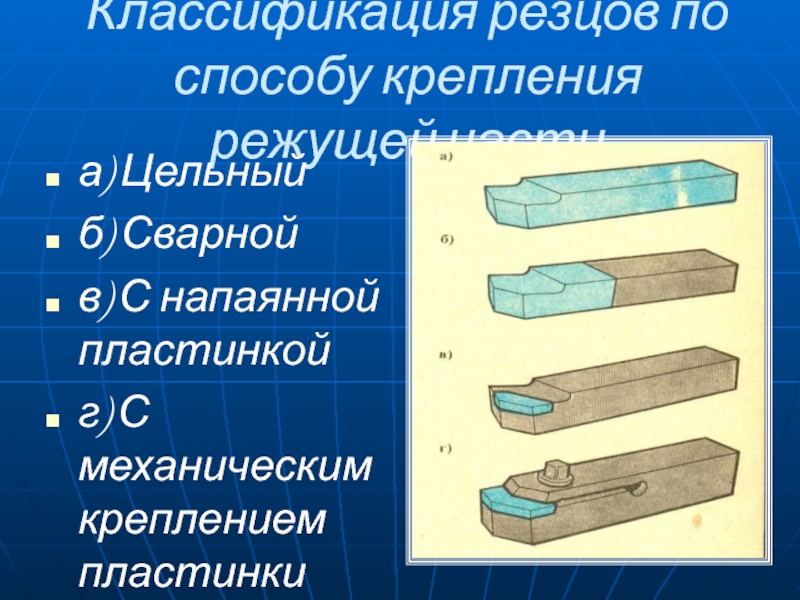 Классификация резцов по способу крепления режущей частиа) Цельныйб) Сварнойв) С напаянной пластинкойг) С механическим креплением пластинки