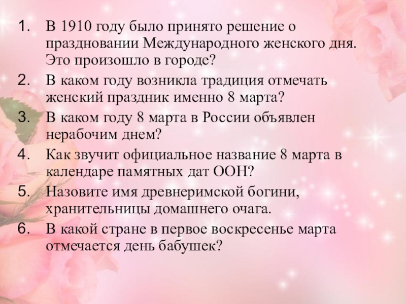 В 1910 году было принято решение о праздновании Международного женского дня. Это произошло в городе?В каком году возникла традиция отмечать женский праздник именно 8 марта?В каком году 8 марта в России объявлен нерабочим днем?Как звучит официальное