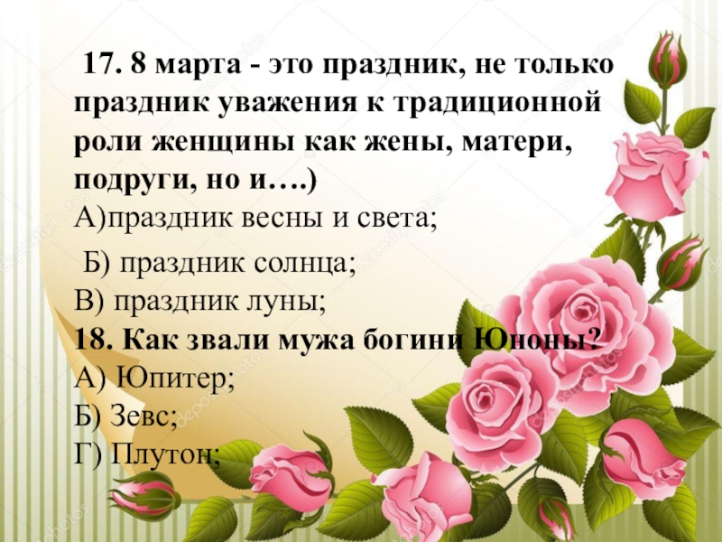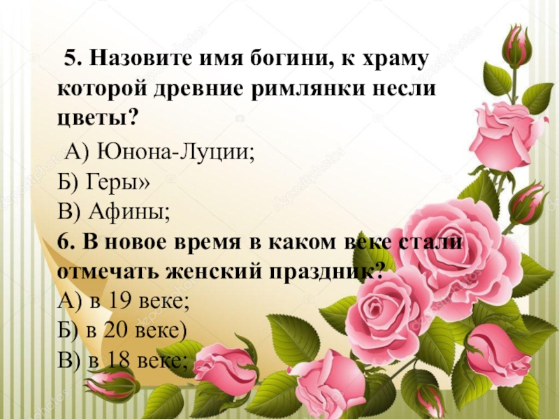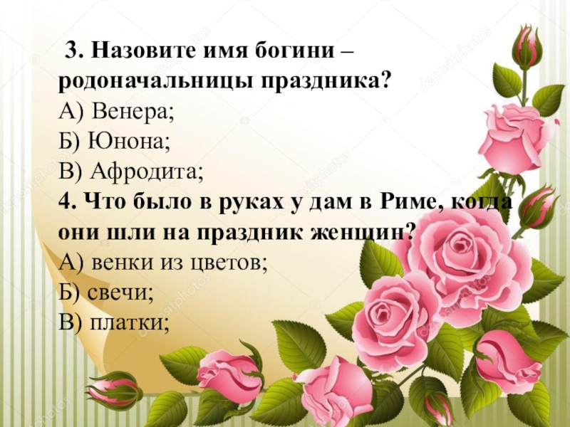 Слайд 7 3. Назовите имя богини – родоначальницы праздника? А) Венера; Б) Юнона; В) Афродита; 4. Что