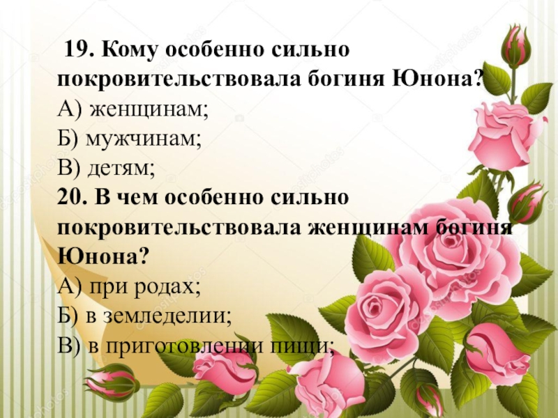 Слайд 15 19. Кому особенно сильно покровительствовала богиня Юнона? А) женщинам; Б) мужчинам; В) детям; 20. В