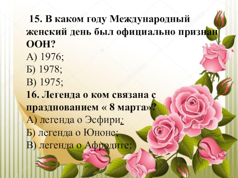 1976; Б) 1978; В) 1975; 16. Легенда о ком связана с празднованием « 8 марта»? А) легенда о Эсфири; Б) легенда о Юноне; В) легенда о Афродите;