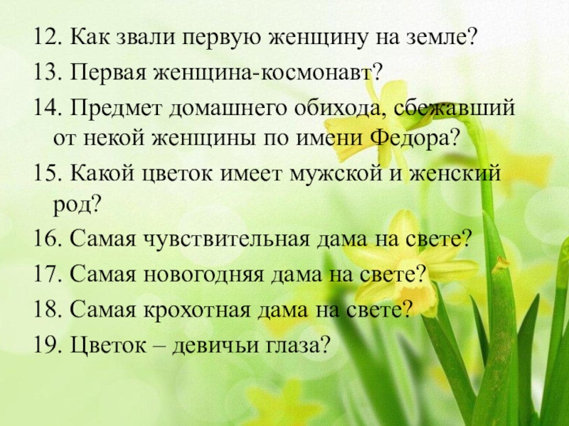 12. Как звали первую женщину на земле?13. Первая женщина-космонавт?14. Предмет домашнего обихода, сбежавший от некой женщины по