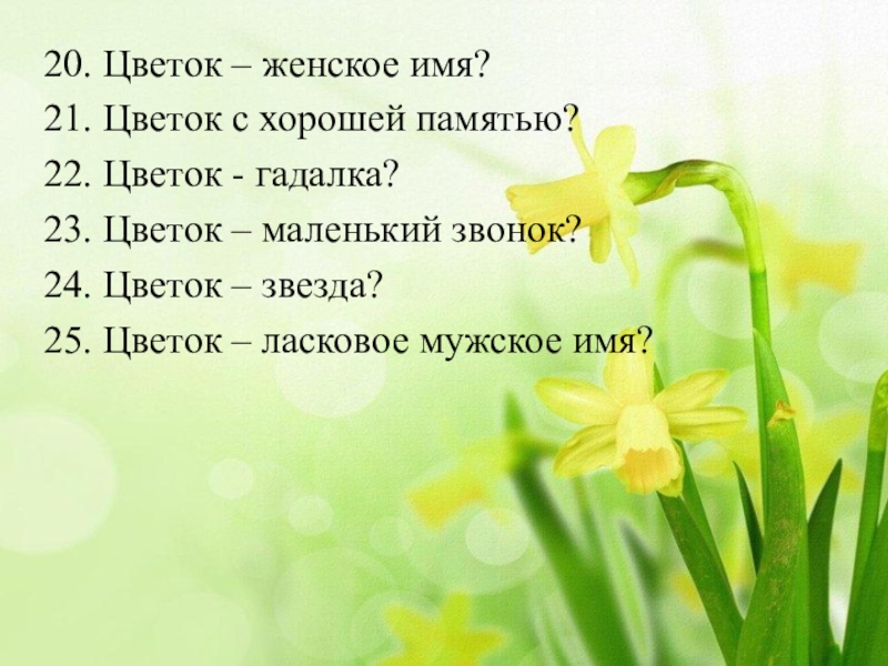 20. Цветок – женское имя?21. Цветок с хорошей памятью?22. Цветок - гадалка?23. Цветок – маленький звонок?24. Цветок