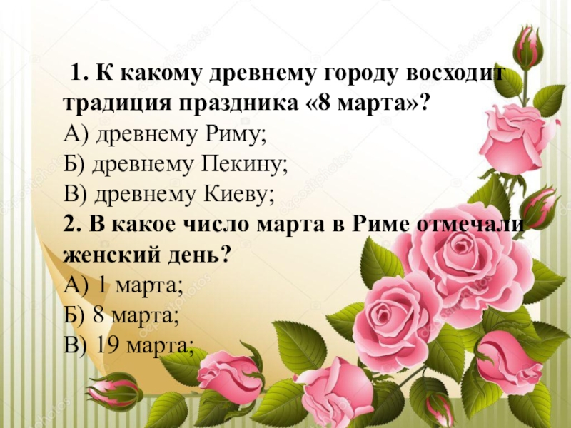 1. К какому древнему городу восходит традиция праздника «8 марта»? А) древнему Риму; Б) древнему Пекину; В)