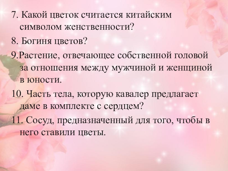 7. Какой цветок считается китайским символом женственности?8. Богиня цветов?9.Растение, отвечающее собственной головой за отношения между мужчиной и