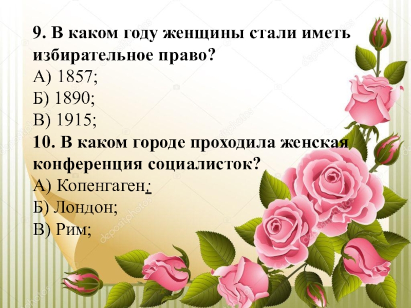 Слайд 109. В каком году женщины стали иметь избирательное право? А) 1857; Б) 1890; В)