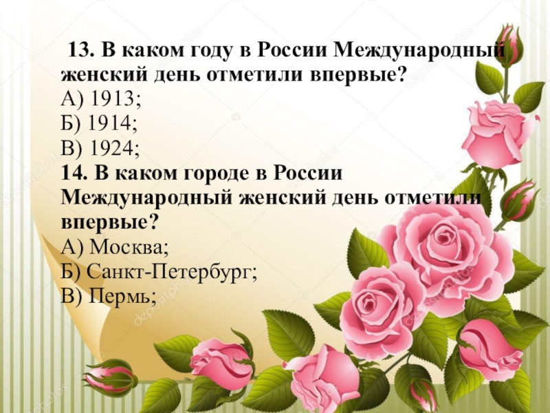 Слайд 12 13. В каком году в России Международный женский день отметили впервые? А)