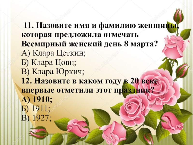 день 8 марта? А) Клара Цеткин; Б) Клара Цовц; В) Клара Юркич; 12. Назовите в каком году в 20 веке впервые отметили этот праздник? А) 1910; Б) 1911; В) 1927;