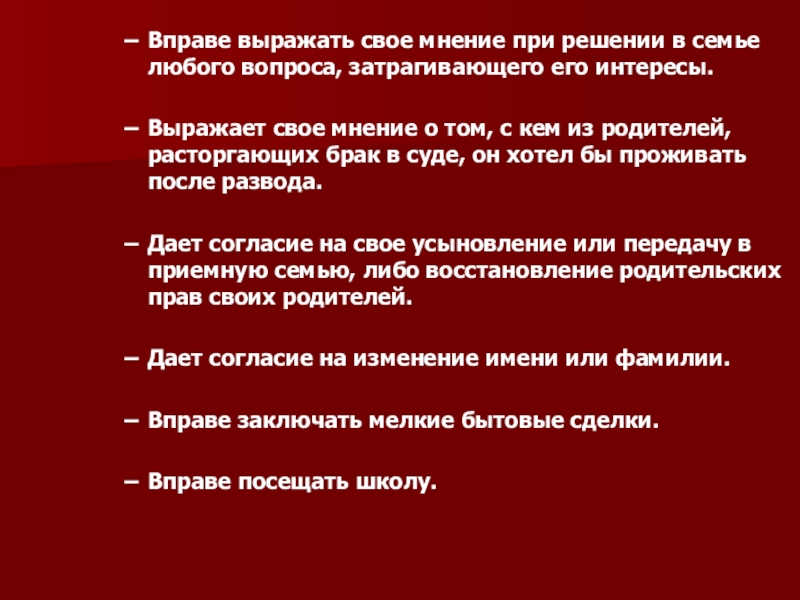 Слайд 10Вправе выражать свое мнение при решении в семье любого вопроса, затрагивающего