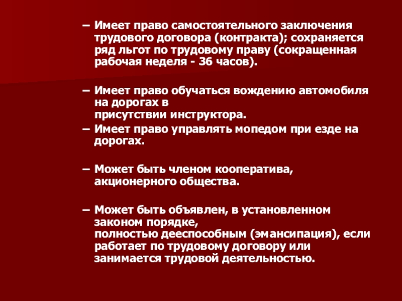 Слайд 6Имеет право самостоятельного заключения трудового договора (контракта); сохраняется ряд льгот по