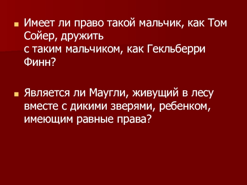 Слайд 13Имеет ли право такой мальчик, как Том Сойер, дружить
