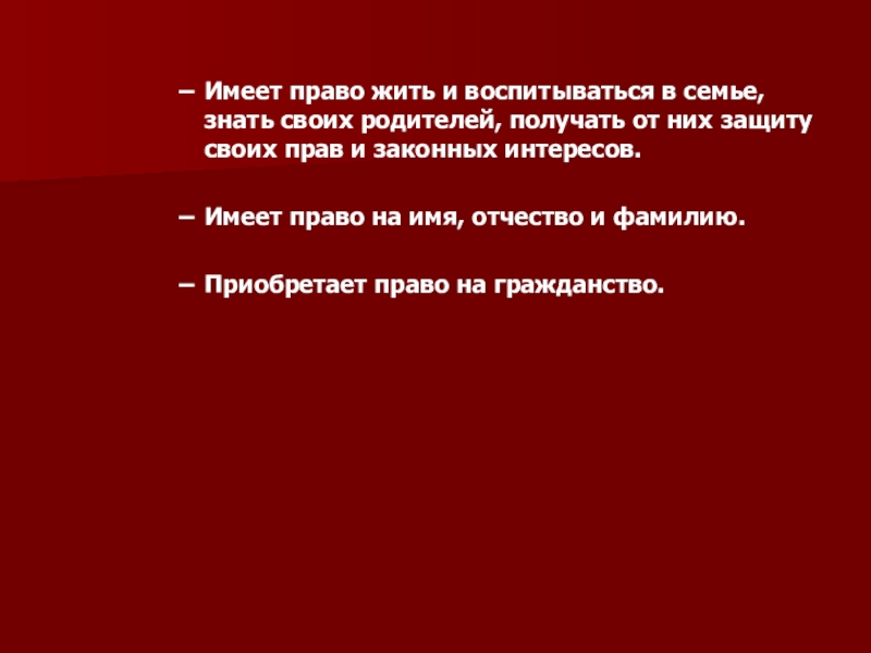 Слайд 11Имеет право жить и воспитываться в семье, знать своих родителей, получать