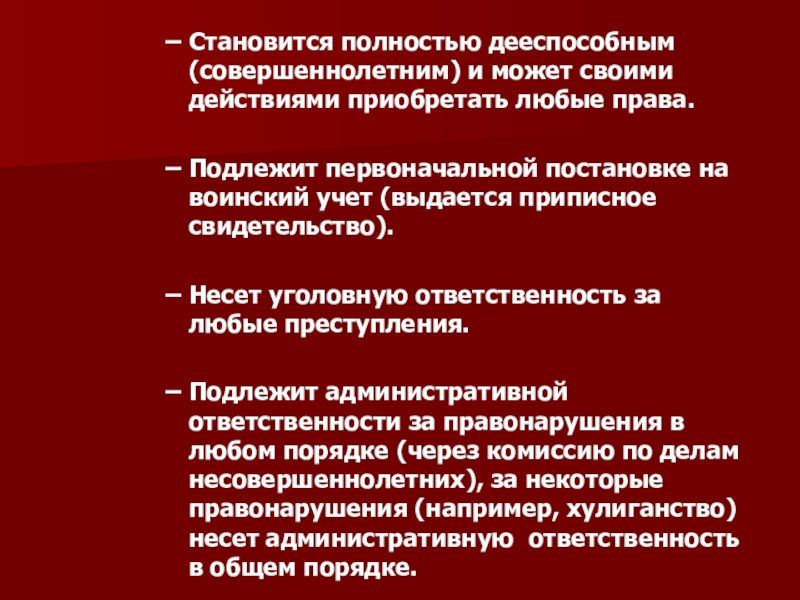 Слайд 5Становится полностью дееспособным (совершеннолетним) и может своими действиями приобретать любые права.