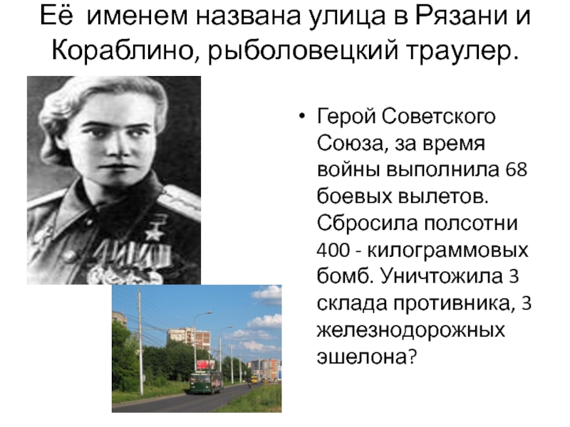 Союза, за время войны выполнила 68 боевых вылетов. Сбросила полсотни 400 - килограммовых бомб. Уничтожила 3 склада противника, 3 железнодорожных эшелона?