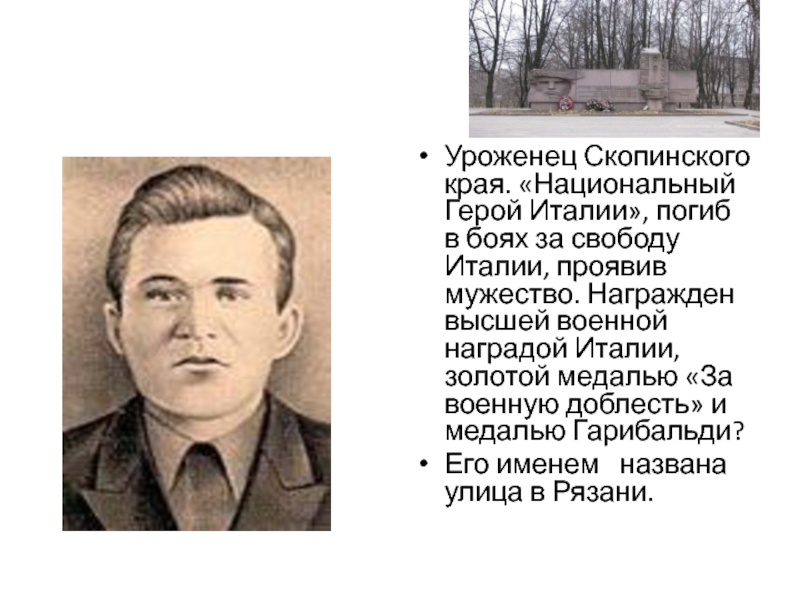 Уроженец Скопинского края. «Национальный Герой Италии», погиб в боях за свободу