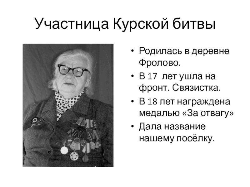 Участница Курской битвыРодилась в деревне Фролово.В 17 лет ушла на фронт. Связистка. В 18 лет награждена медалью