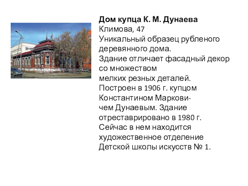 Слайд 105. Дом купца К. М. Дунаева