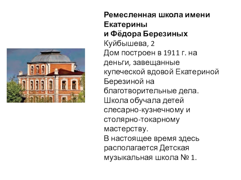 купеческой вдовой Екатериной Березиной на благотворительные дела. Школа обучала детей слесарно-кузнечному и столярно-токарному мастерству.