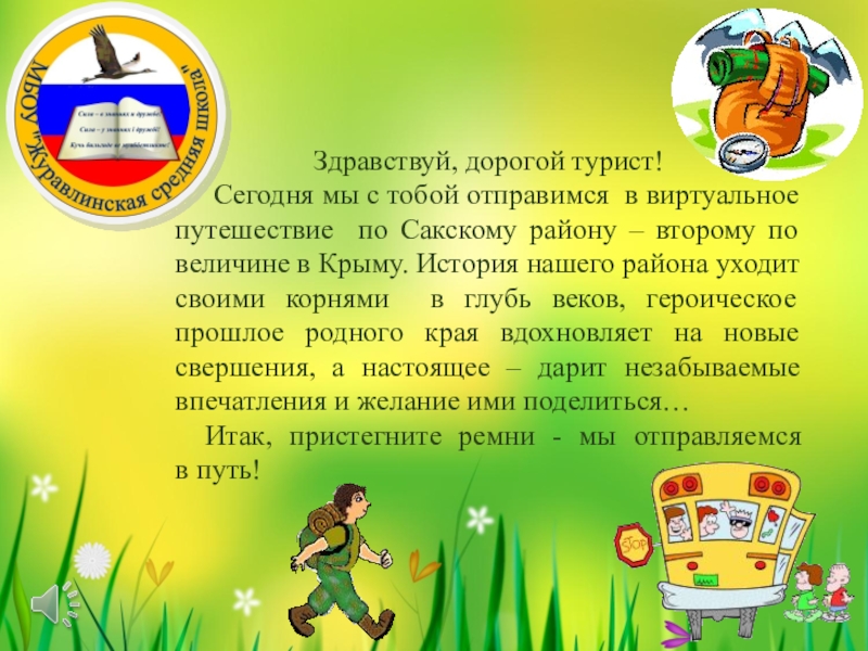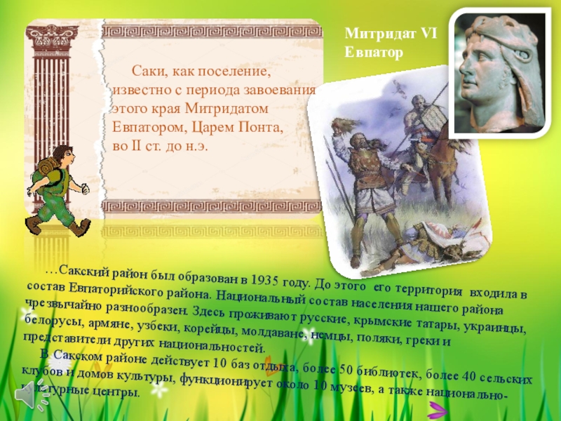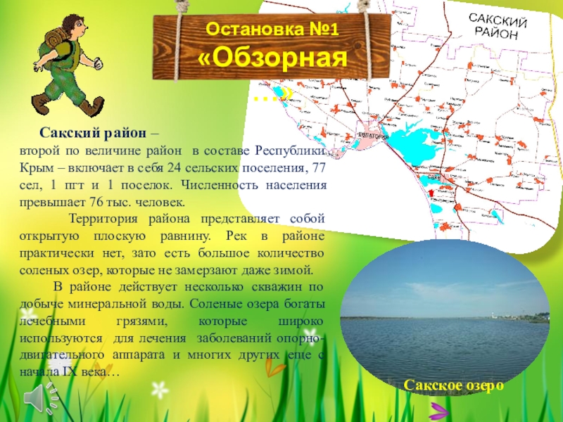…Сакский район был образован в 1935 году. До этого его территория входила в состав Евпаторийского района. Национальный состав населения нашего района чрезвычайно разнообразен. Здесь проживают русские, крымские татары, украинцы, белорусы, армяне, узбеки, корейцы, молдаване, немцы, поляки, греки и представители других национальностей.