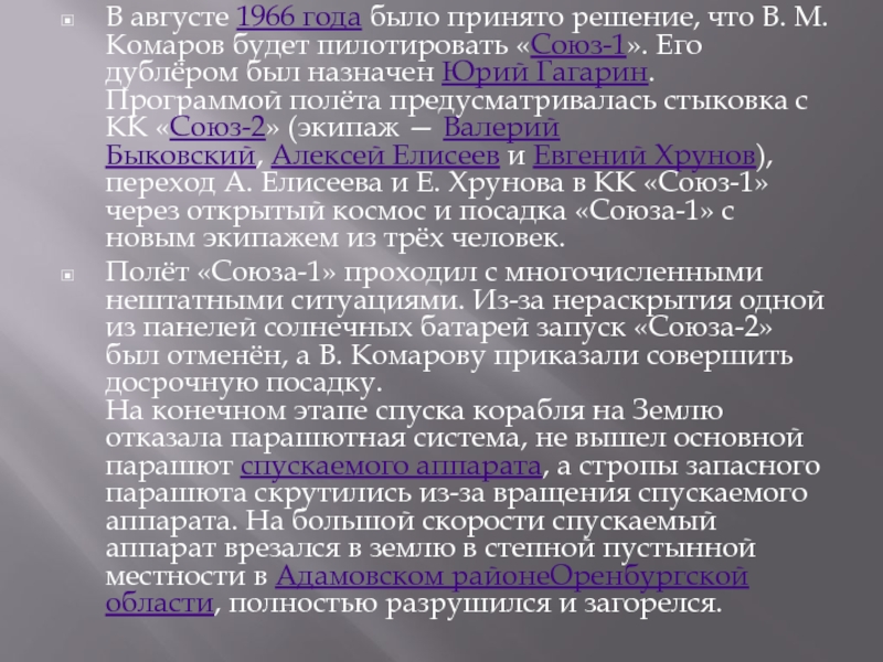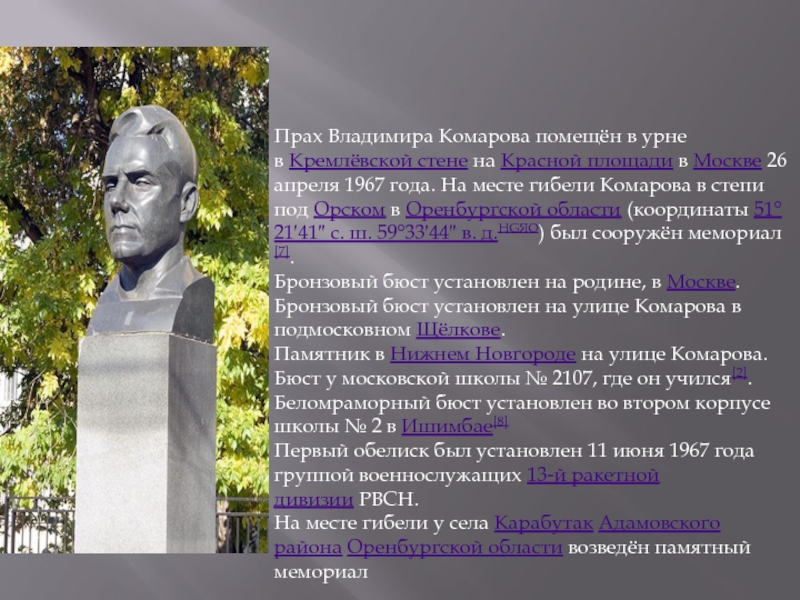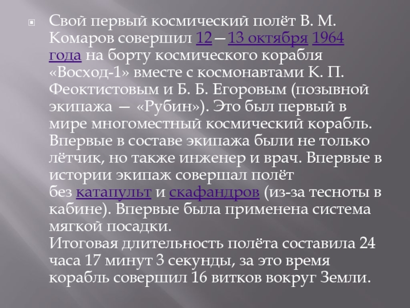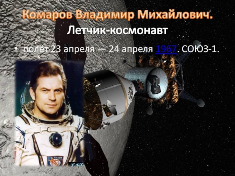 раз звание присвоено посмертно), инженер-полковник авиации[1]. Командир первого в мире экипажа космического корабля, причём сразу из трёх человек. Дважды летал на первых кораблях нового типа: «Восход-1» и «Союз-1». Первый человек, побывавший в космосе дважды. Первый человек, погибший во время полёта в космос.