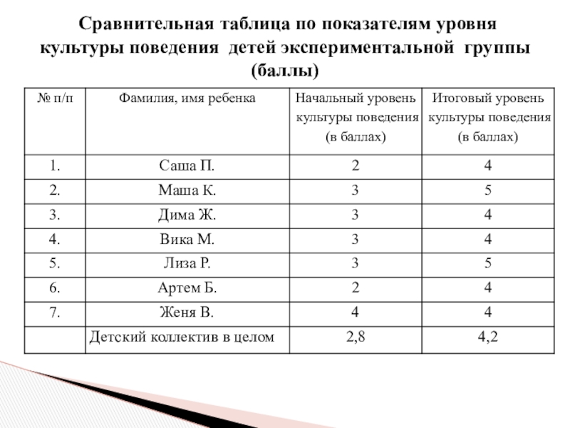 Слайд 14 Сравнительная таблица по показателям уровня культуры поведения детей экспериментальной группы