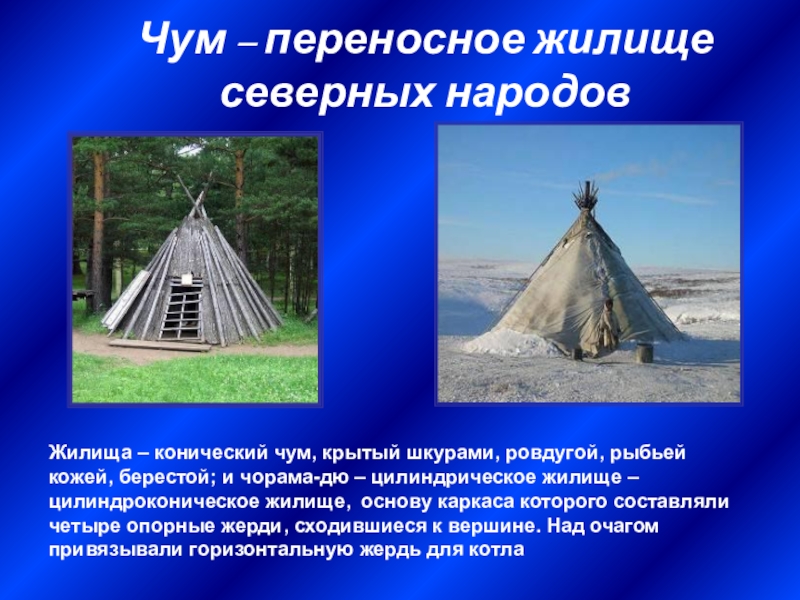 ровдугой, рыбьей кожей, берестой; и чорама-дю – цилиндрическое жилище – цилиндроконическое жилище, основу каркаса которого составляли четыре опорные жерди, сходившиеся к вершине. Над очагом привязывали горизонтальную жердь для котла