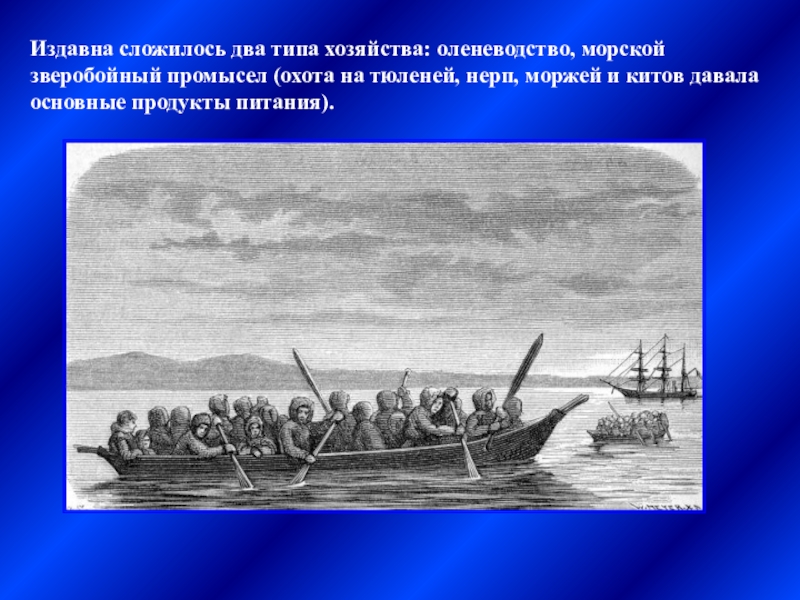 Слайд 26Издавна сложилось два типа хозяйства: оленеводство, морской зверобойный промысел (охота на