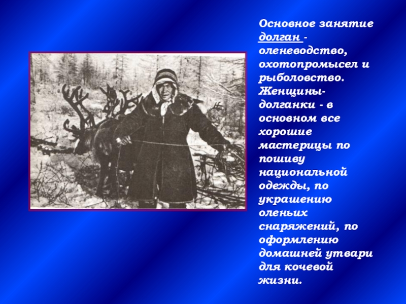 Слайд 24Основное занятие долган - оленеводство, охотопромысел и рыболовство.