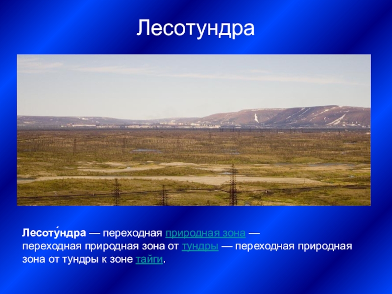 Лесоту́ндра — переходная природная зона — переходная природная зона от тундры — переходная природная зона от тундры к зоне тайги.