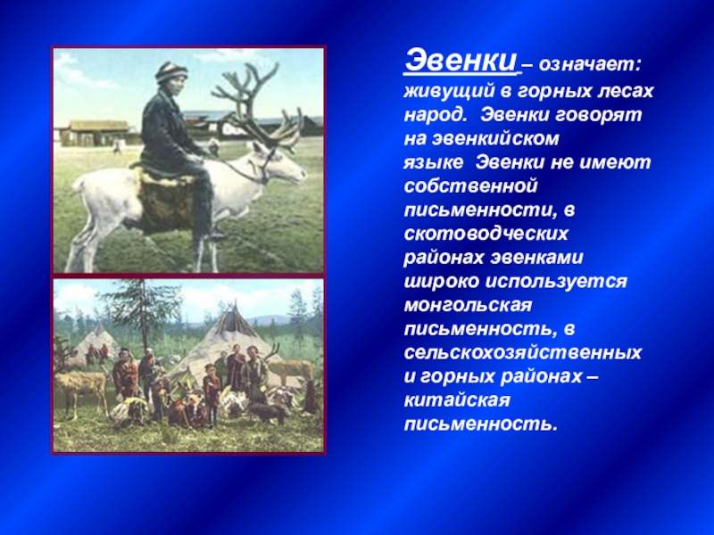 Слайд 17Эвенки – означает: живущий в горных лесах народ. Эвенки говорят на