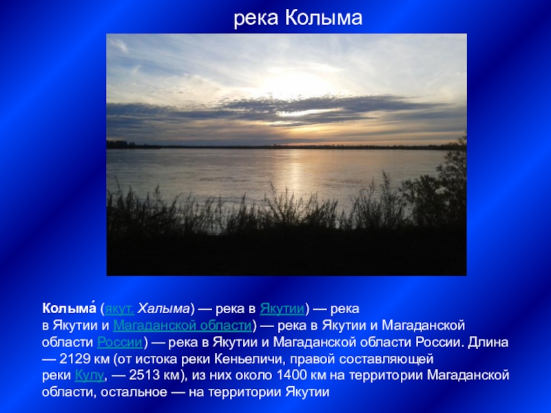 Колыма́ (якут. Халыма) — река в Якутии) — река в Якутии и Магаданской области) — река в Якутии и Магаданской области России) — река