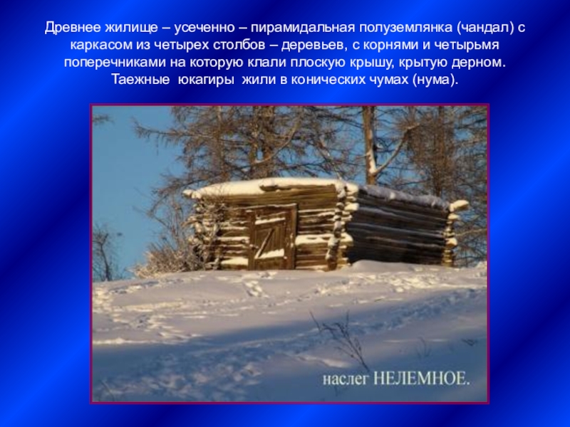 четырех столбов – деревьев, с корнями и четырьмя поперечниками на которую клали плоскую крышу, крытую дерном. Таежные юкагиры жили в конических чумах (нума).