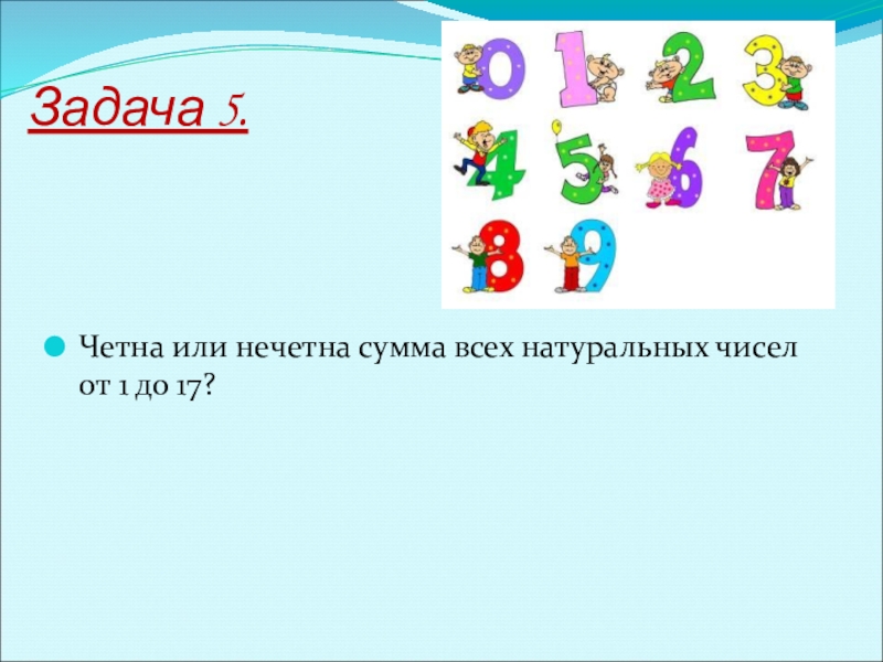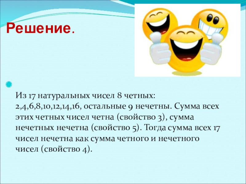всех этих четных чисел четна (свойство 3), сумма нечетных нечетна (свойство 5). Тогда сумма всех 17 чисел нечетна как сумма четного и нечетного чисел (свойство 4).