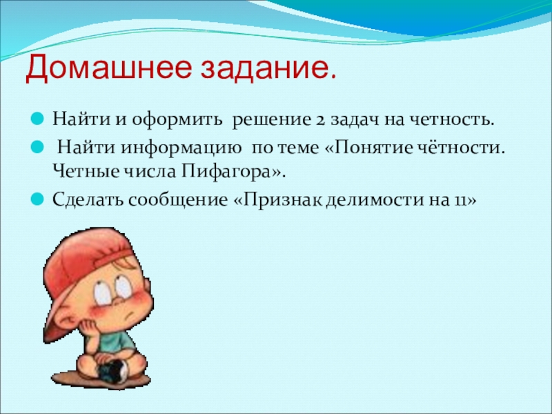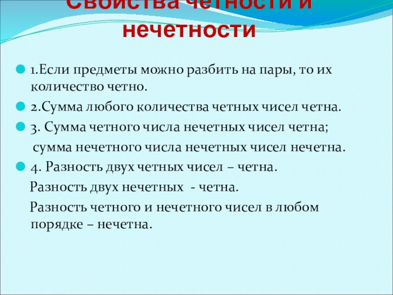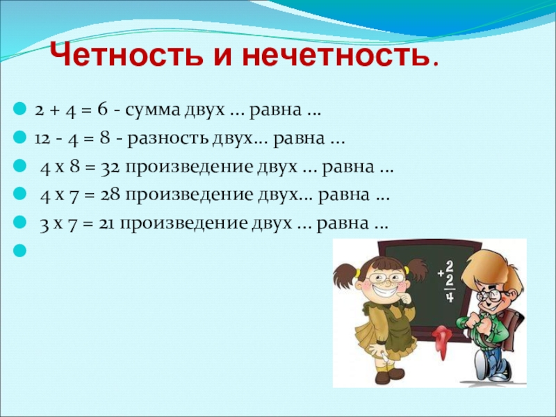 Два целых числа называются числами одинаковой четности, если оба они четные или оба нечетные. Два целых числа называются числами разной четности, если одно из них четное, а другое нечетное