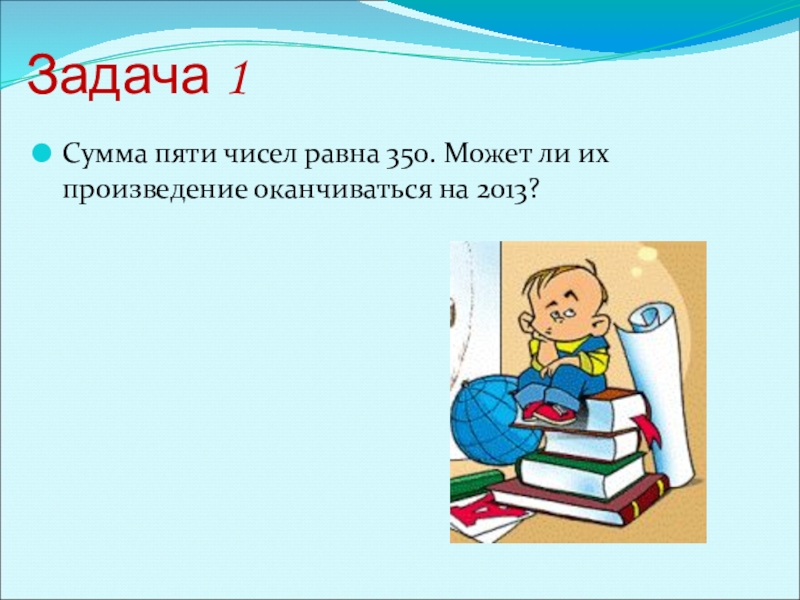 Сумма пяти чисел равна 350. Может ли их произведение оканчиваться