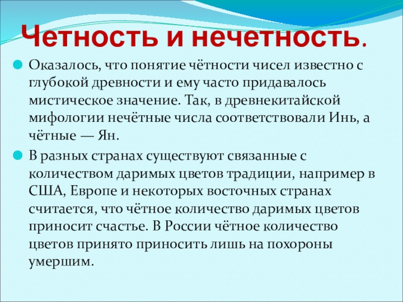 и ему часто придавалось мистическое значение. Так, в древнекитайской мифологии нечётные числа соответствовали Инь, а чётные — Ян.