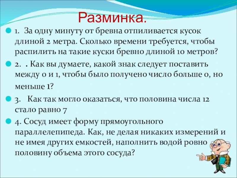 4. Сосуд имеет форму прямоугольного параллелепипеда. Как, не делая никаких измерений и не имея других емкостей, наполнить водой ровно половину объема этого сосуда?