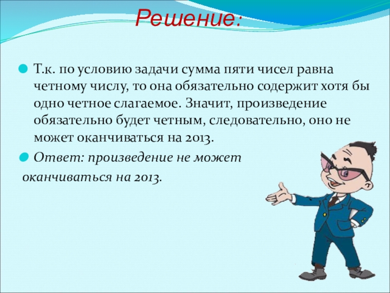 то она обязательно содержит хотя бы одно четное слагаемое. Значит, произведение обязательно будет четным, следовательно, оно не может оканчиваться на 2013.