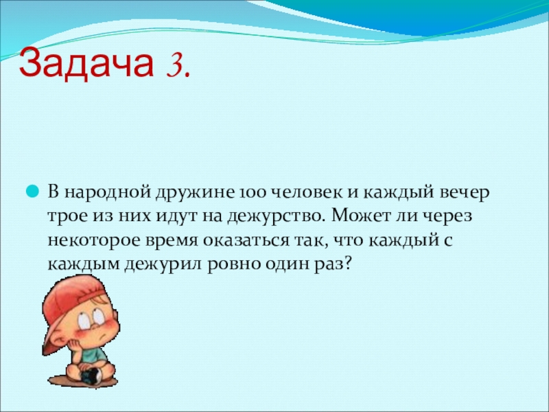 дежурит с двумя другими, то всех остальных можно разбить на пары. Однако 99 – нечетное число