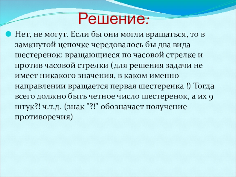 цепочке чередовалось бы два вида шестеренок: вращающиеся по часовой стрелке и против часовой стрелки (для решения задачи не имеет никакого значения, в каком именно направлении вращается первая шестеренка !) Тогда всего должно быть четное число шестеренок, а их 9 штук?! ч.т.д. (знак "?!" обозначает получение противоречия)