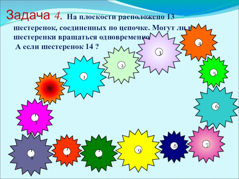 Задача 4. На плоскости расположено 13 шестеренок, соединенных по цепочке. Могут