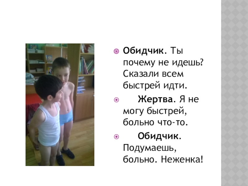 Слайд 20Обидчик. Ты почему не идешь? Сказали всем быстрей идти.
