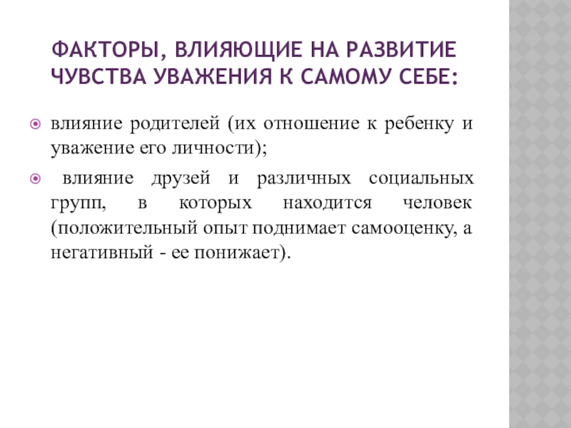 Слайд 4Факторы, влияющие на развитие чувства уважения к самому себе: