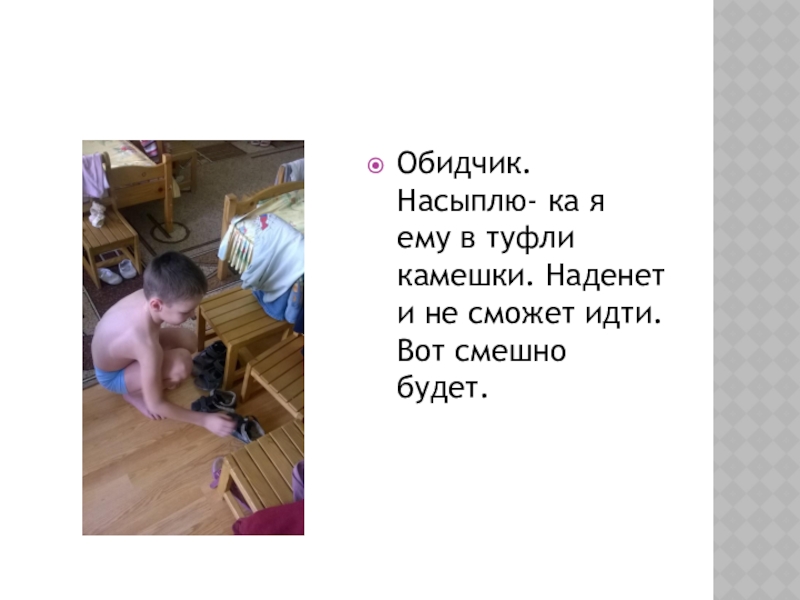 Слайд 17Обидчик. Насыплю- ка я ему в туфли камешки. Наденет и не