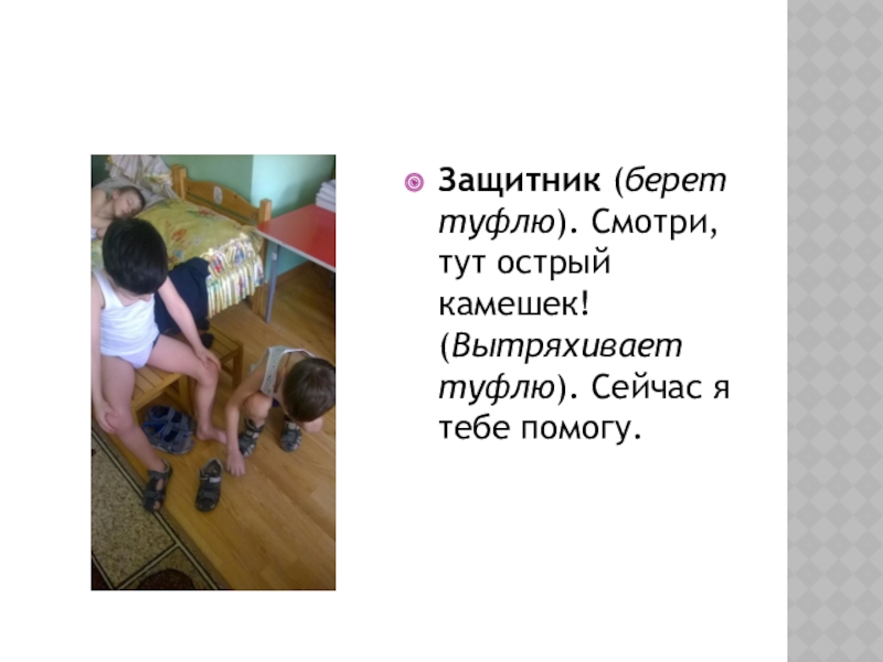 Слайд 21Защитник (берет туфлю). Смотри, тут острый камешек! (Вытряхивает туфлю). Сейчас я тебе