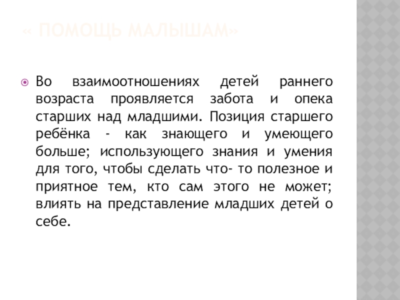 старших над младшими. Позиция старшего ребёнка - как знающего и умеющего больше; использующего знания и умения для того, чтобы сделать что- то полезное и приятное тем, кто сам этого не может; влиять на представление младших детей о себе.
