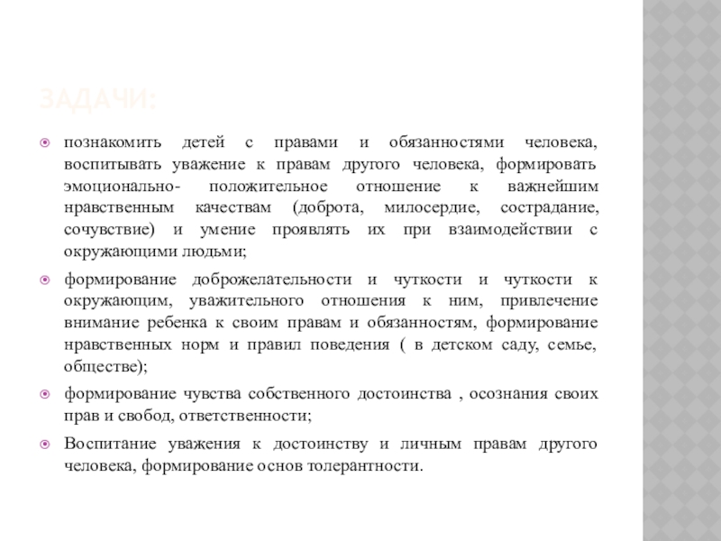 познакомить детей с правами и обязанностями человека, воспитывать уважение к правам